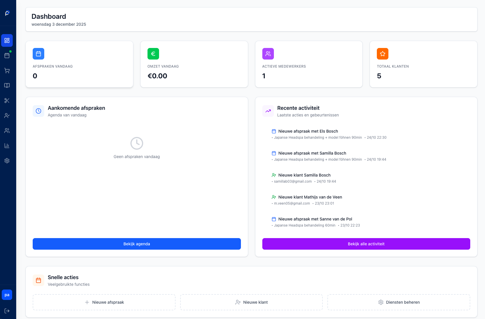 Bekijk alle belangrijke informatie op één scherm. Van vandaag's afspraken tot omzet en statistieken - alles binnen handbereik.