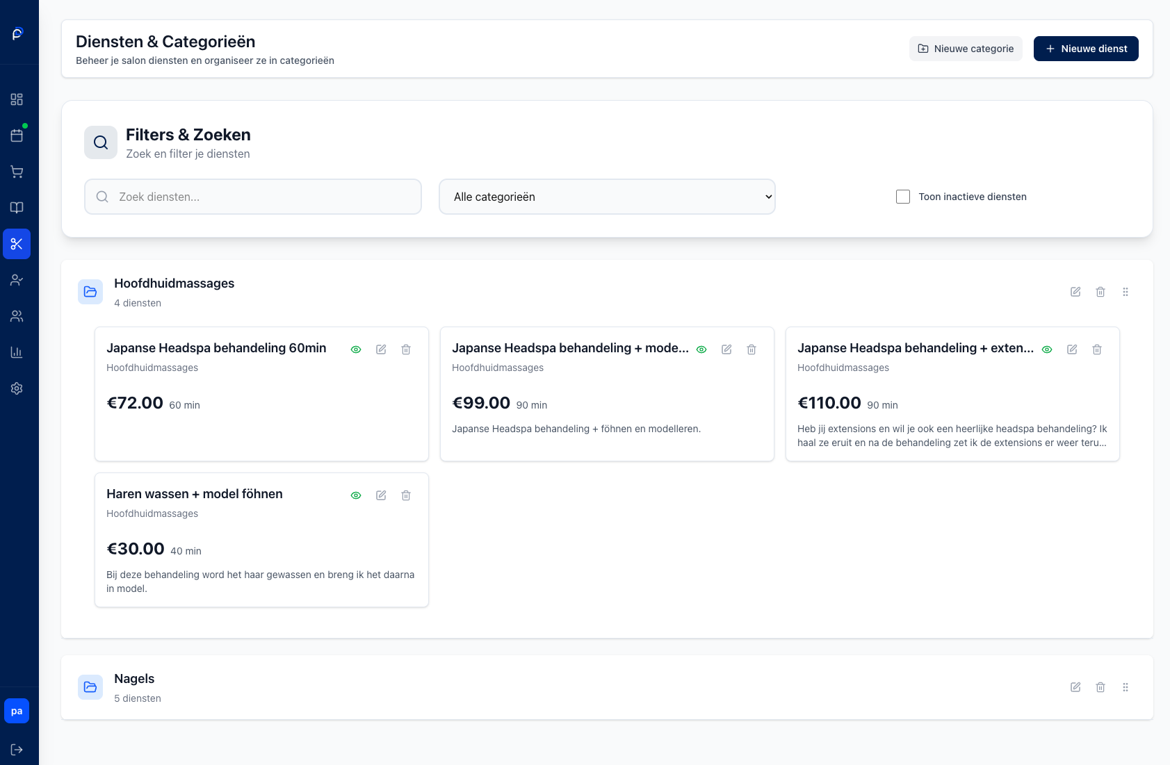 Organiseer je diensten per categorie. Voeg prijzen, duur en beschrijvingen toe voor een compleet overzicht.