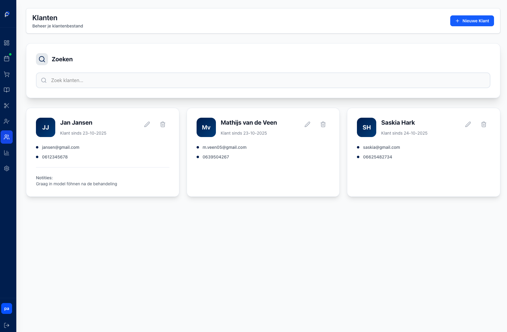 Beheer al je klanten en hun geschiedenis. Bekijk afspraken, notities en voorkeuren per klant.