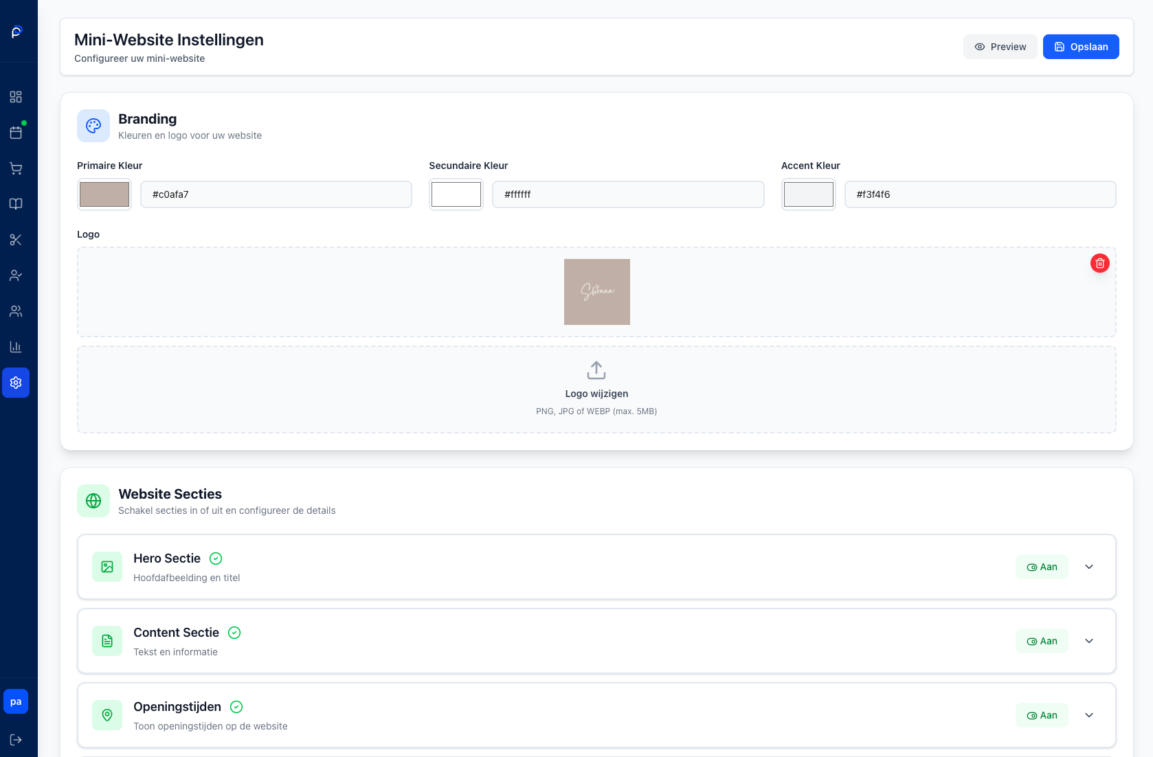Personaliseer je mini site volledig naar jouw wensen. Pas kleuren, logo, tekst en alle instellingen aan zodat het perfect bij jouw salon past.