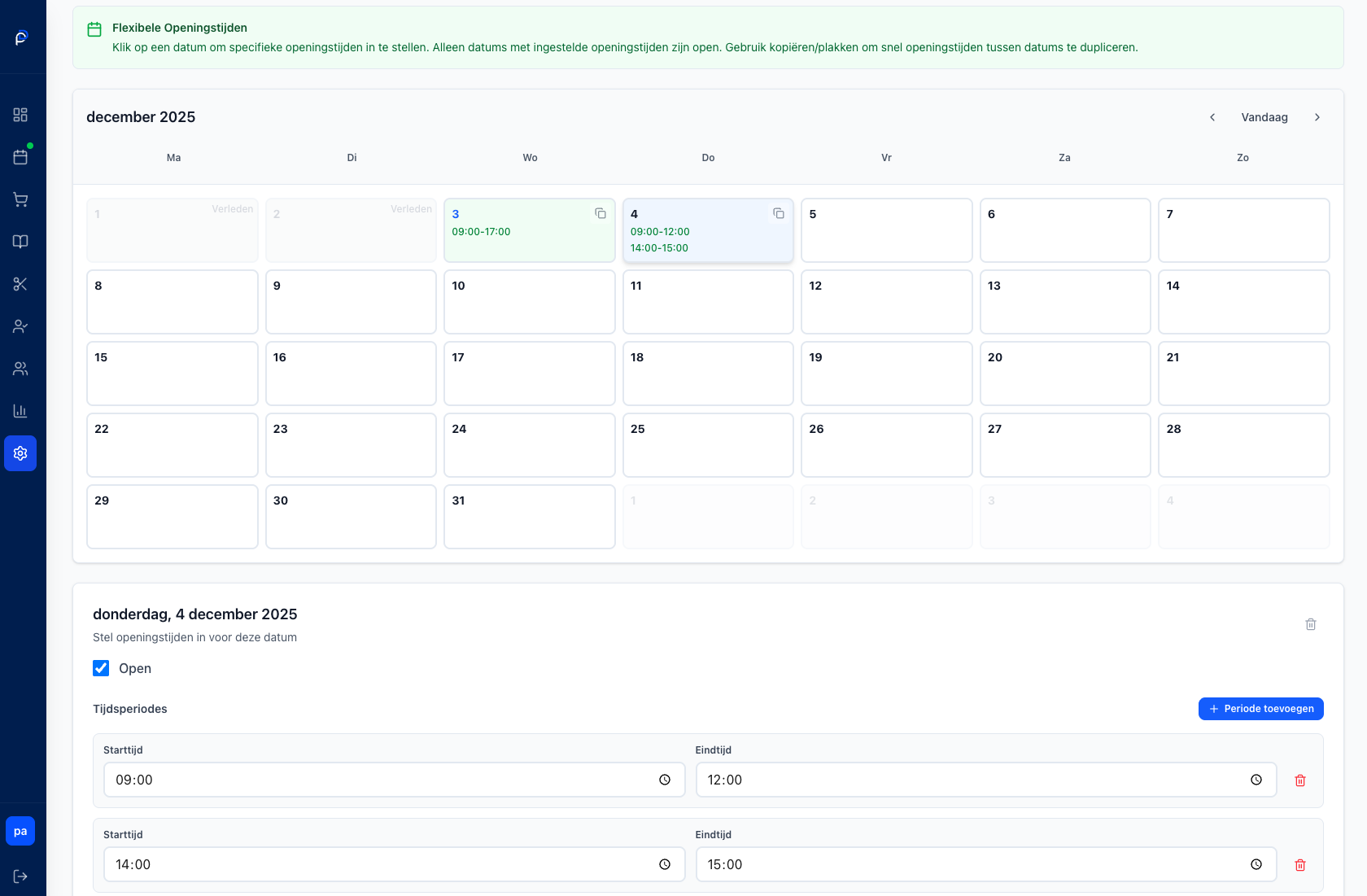 Kies tussen flexibele tijdsblokken per dag of vaste openingstijden. Perfect voor elke salon, of je nu meerdere pauzes hebt of vaste tijden werkt.