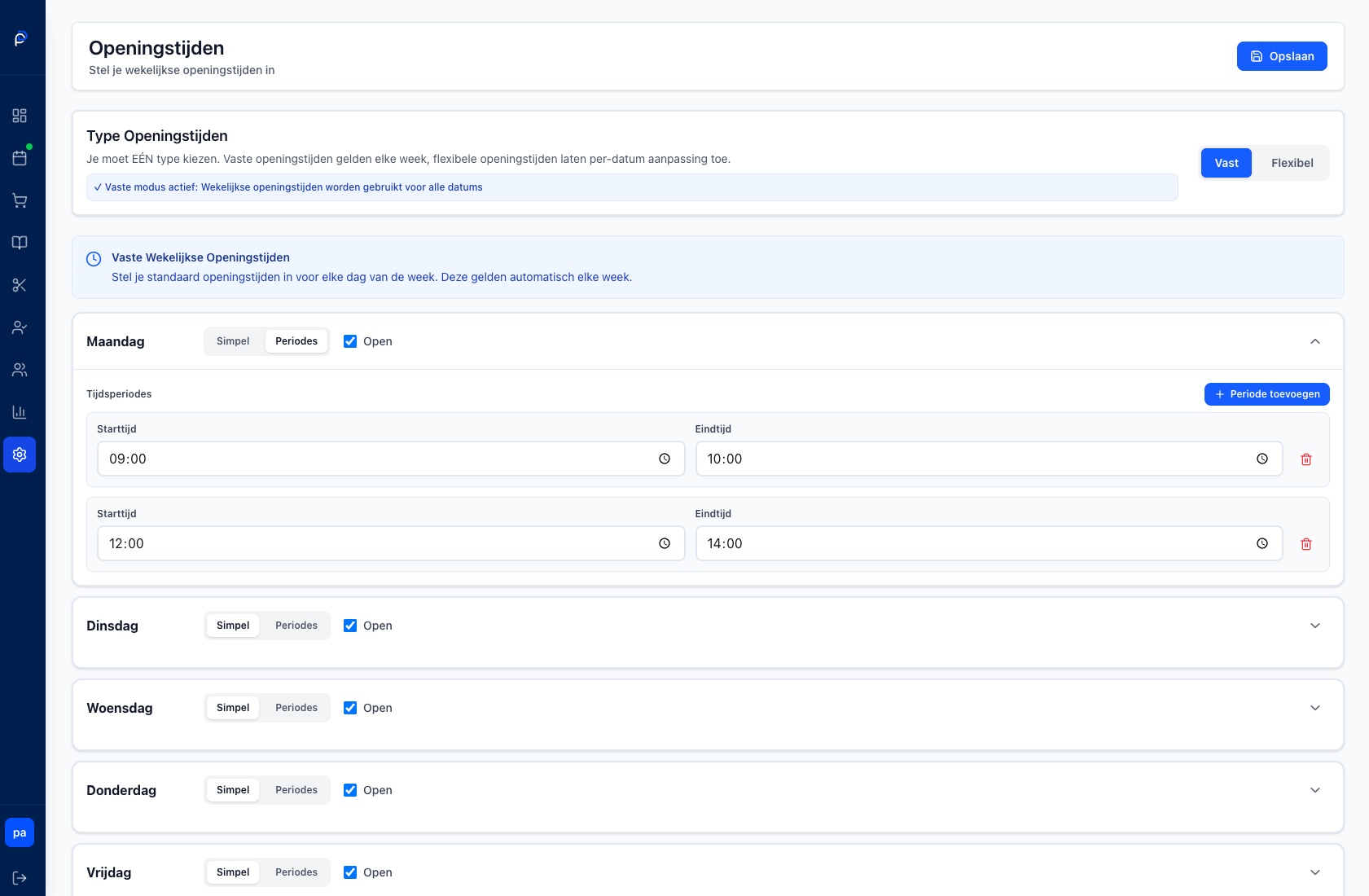 Stel vaste openingstijden in per dag van de week. Perfect voor salons met consistente werktijden.