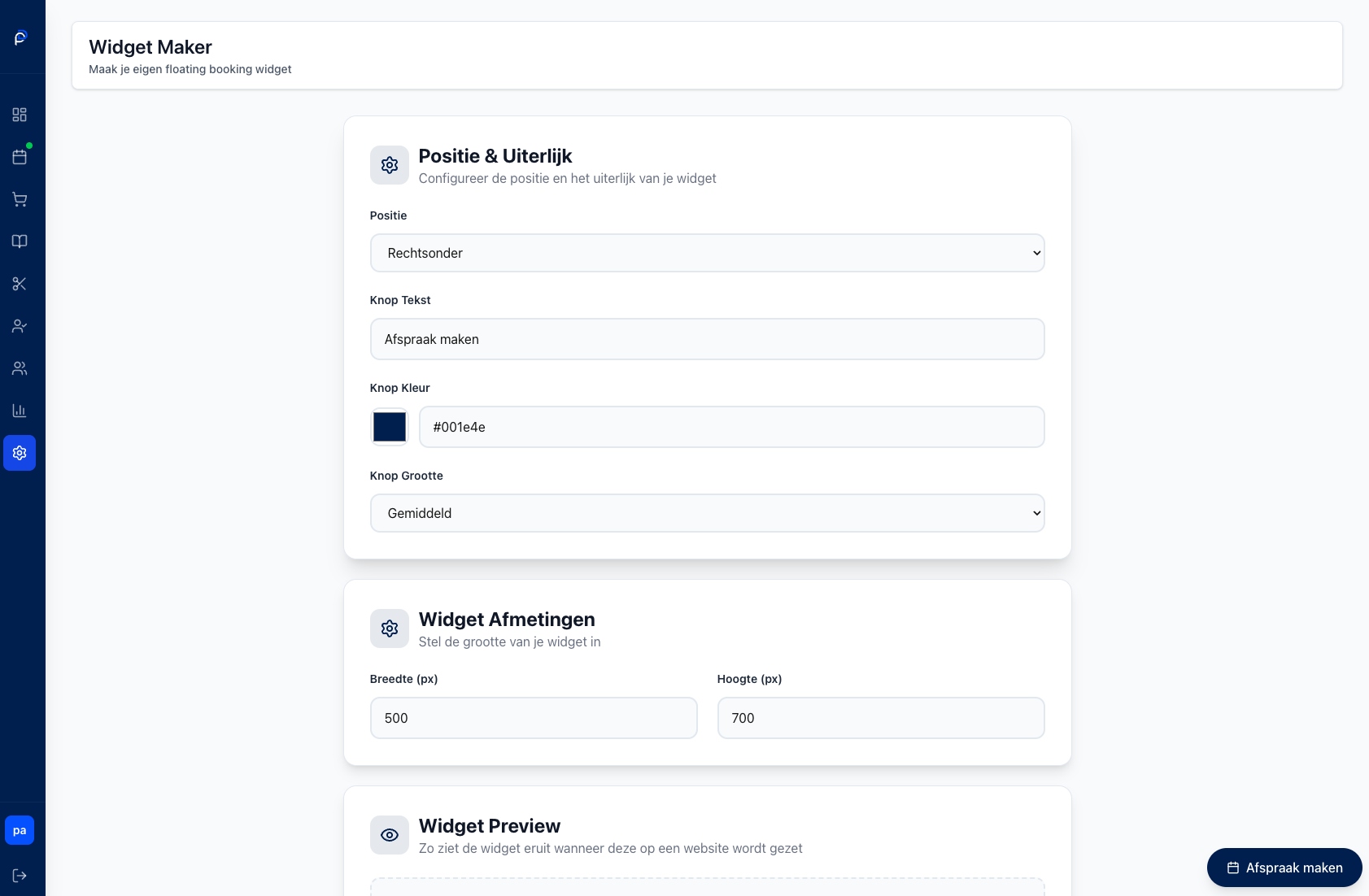 Maak je eigen boekingswidget voor je website. Pas de kleuren en stijl aan aan jouw branding.